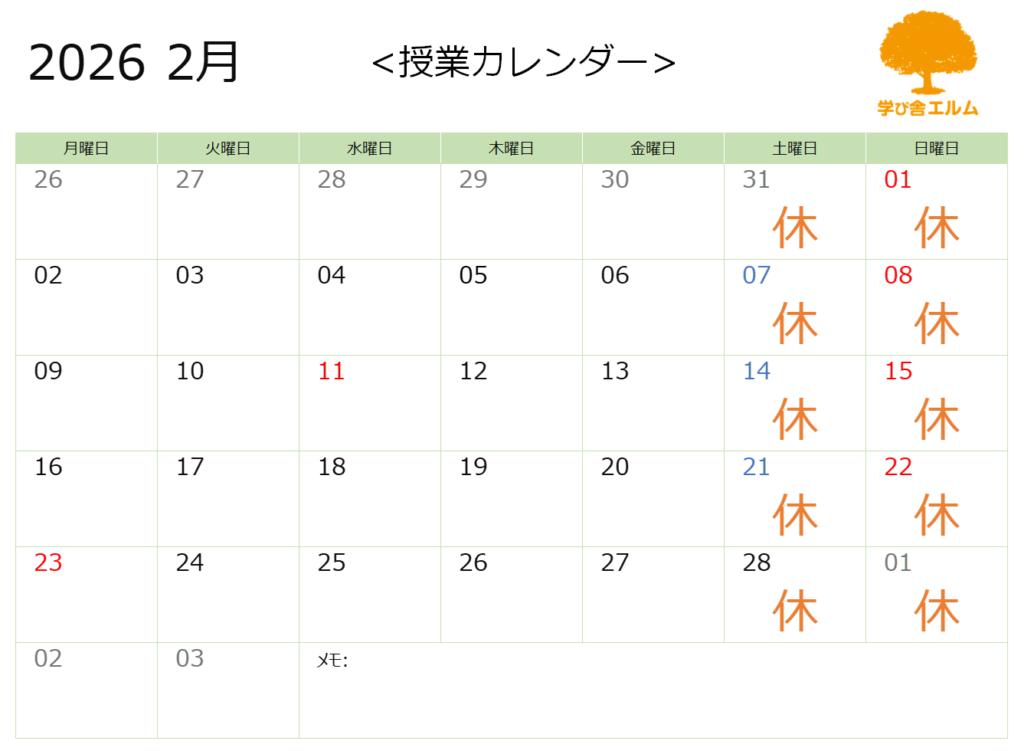 2月の授業カレンダーを公開します。